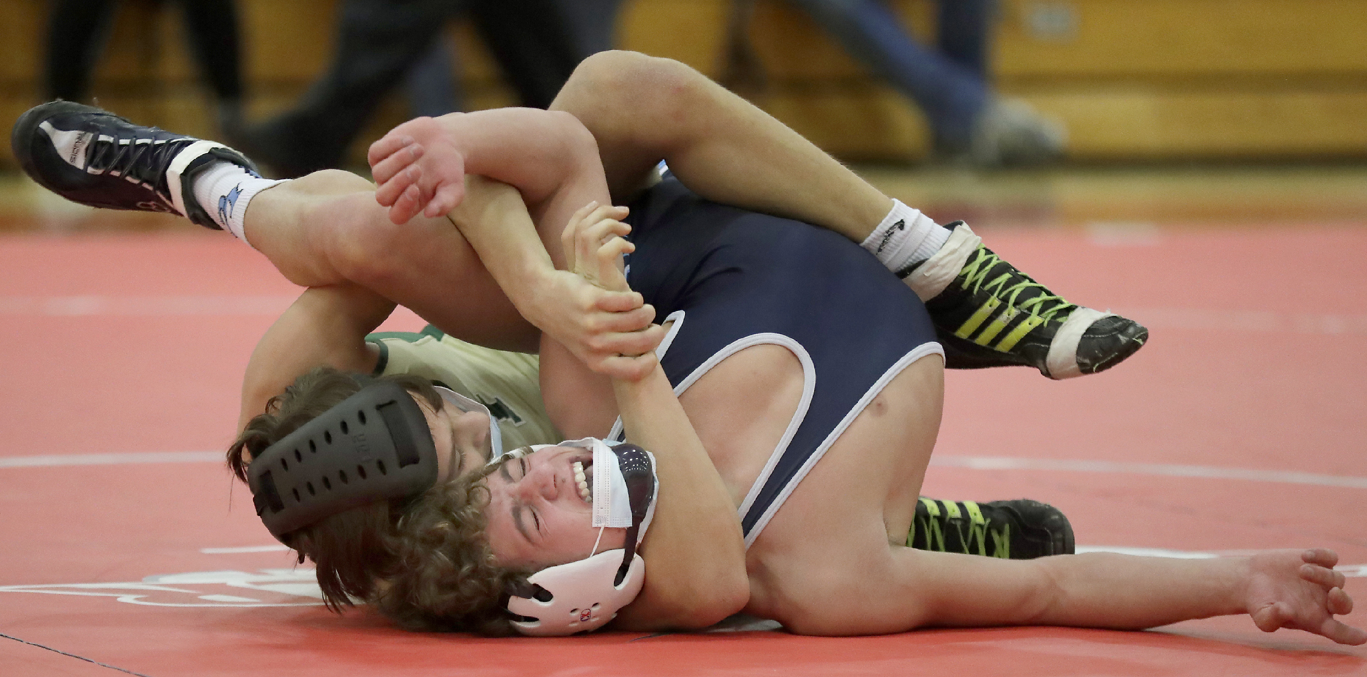 The image of the wrestler in for first place really gives a sense of being in there with the athletes. The low angle and wrestlers emotion really brings it all together. Second place shows the current events with both athletes wearing masks. The background is clean except for the yellow coat in the top right, but otherwise super clean given the situations in gymnasiums. Third place has really great flow throughout the frame.