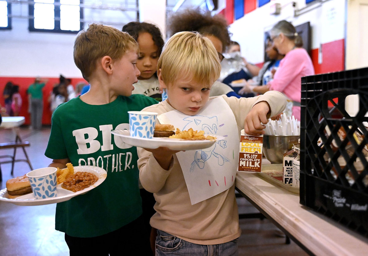 First place could have just been a ho-hum kids in line for school lunch photo which yes would have told the story at hand but the photog found and captured the most interesting main subject who is balancing lunch drink and artwork. Second place is well composed easily read image. Third place is a nice concert shot.
