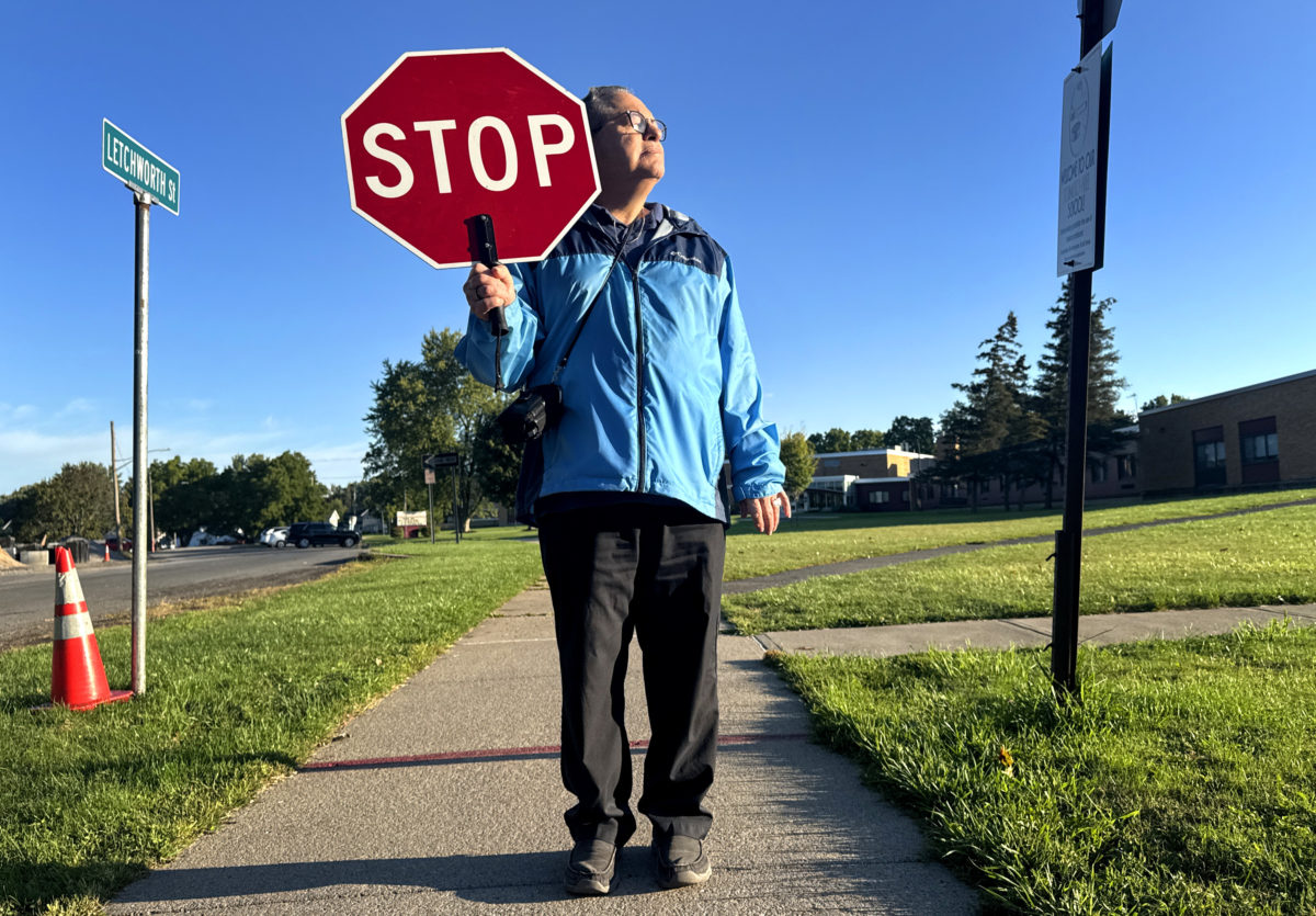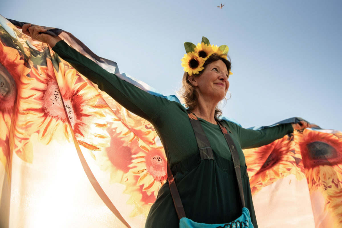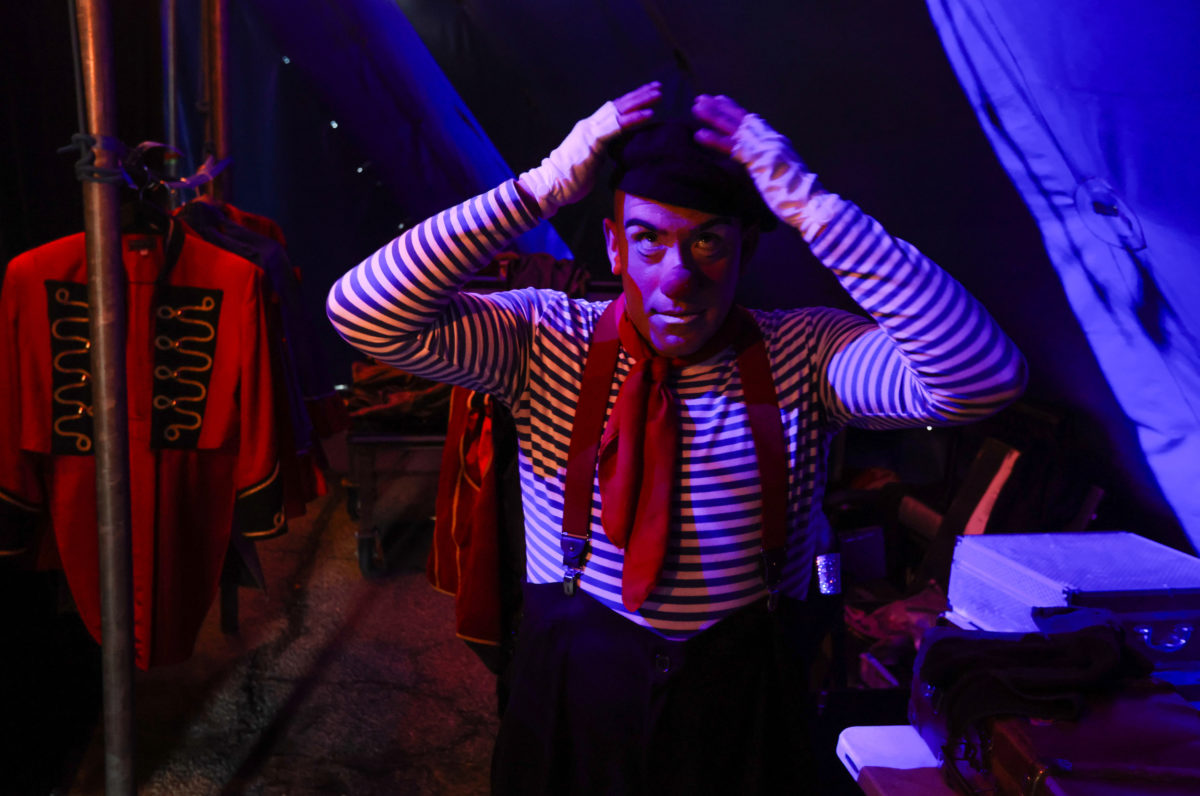 First place was very close between the clown and the woman in costume. The woman in costume won because at first glance it stands out more and the lighting is better. The dragonfly overhead is a nice coincidence. The clown is a great moment backstage with a great expression on his face. Crossing guard is a nice, clean image showing a different take on a first day of school photo.