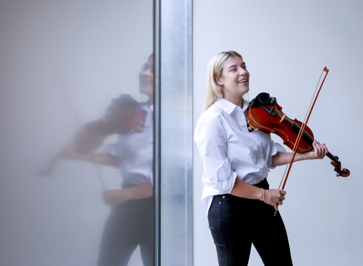 Violinist could have been higher ranking had the full reflection been taken by having the photog move just a half a step to the left.
