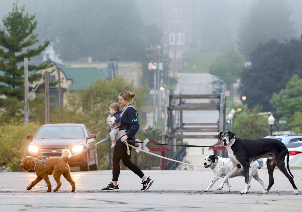 We liked the leading lines of the tombstones that took you through the photo. Composition was nice. It was a genuine moment. The dog walking was nicely composed, good action with a nice use of depth of field. The facepainting reflection in the mirror made this photo. The flags were nicely composed and the drone added intrigue.