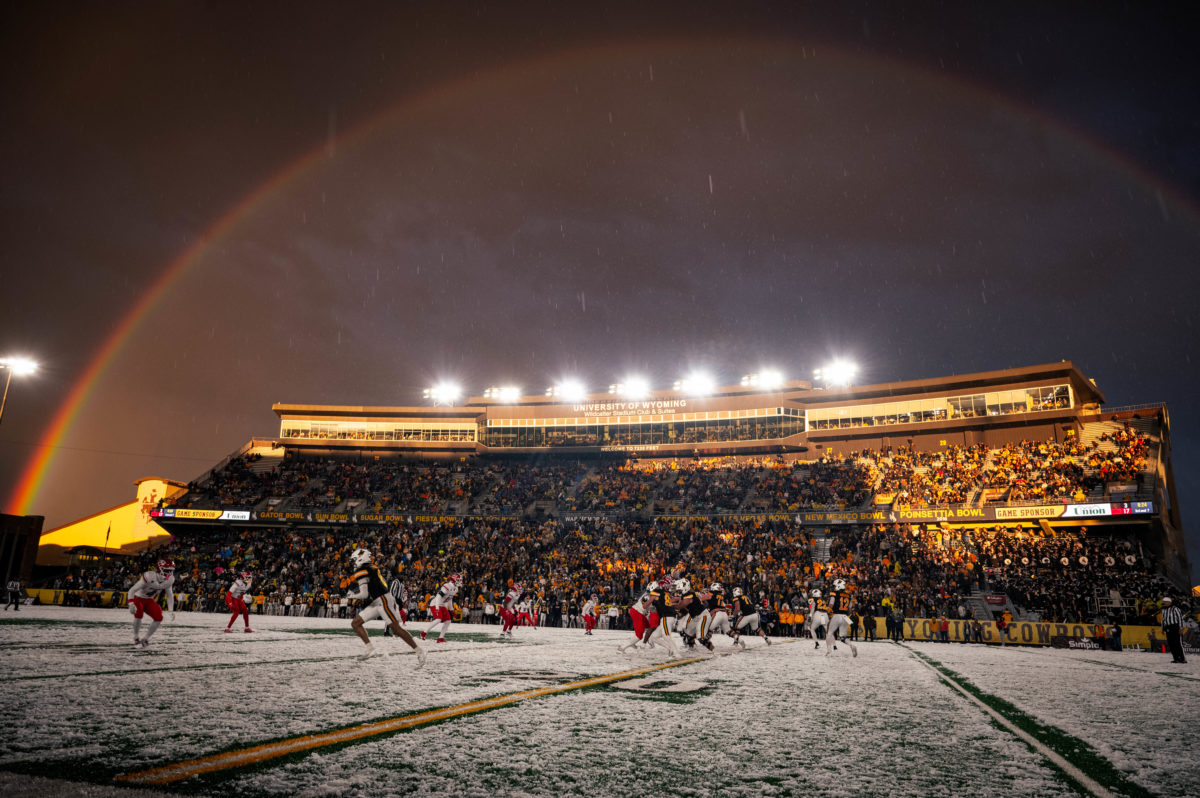 First Place: Snow, rainbow, action…all of it. Clear winner Second Place: Unique found casual moment, photographer found something different off the field. Third Place: Great moment, thrill of victory