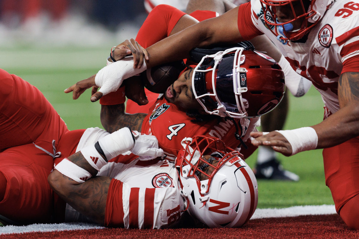 Second: Exceptional timing captures the violence and drama of the scoring moment, with the helmet coming free at the peak of impact. The tight frame and clear expressions heighten the intensity of this decisive play.