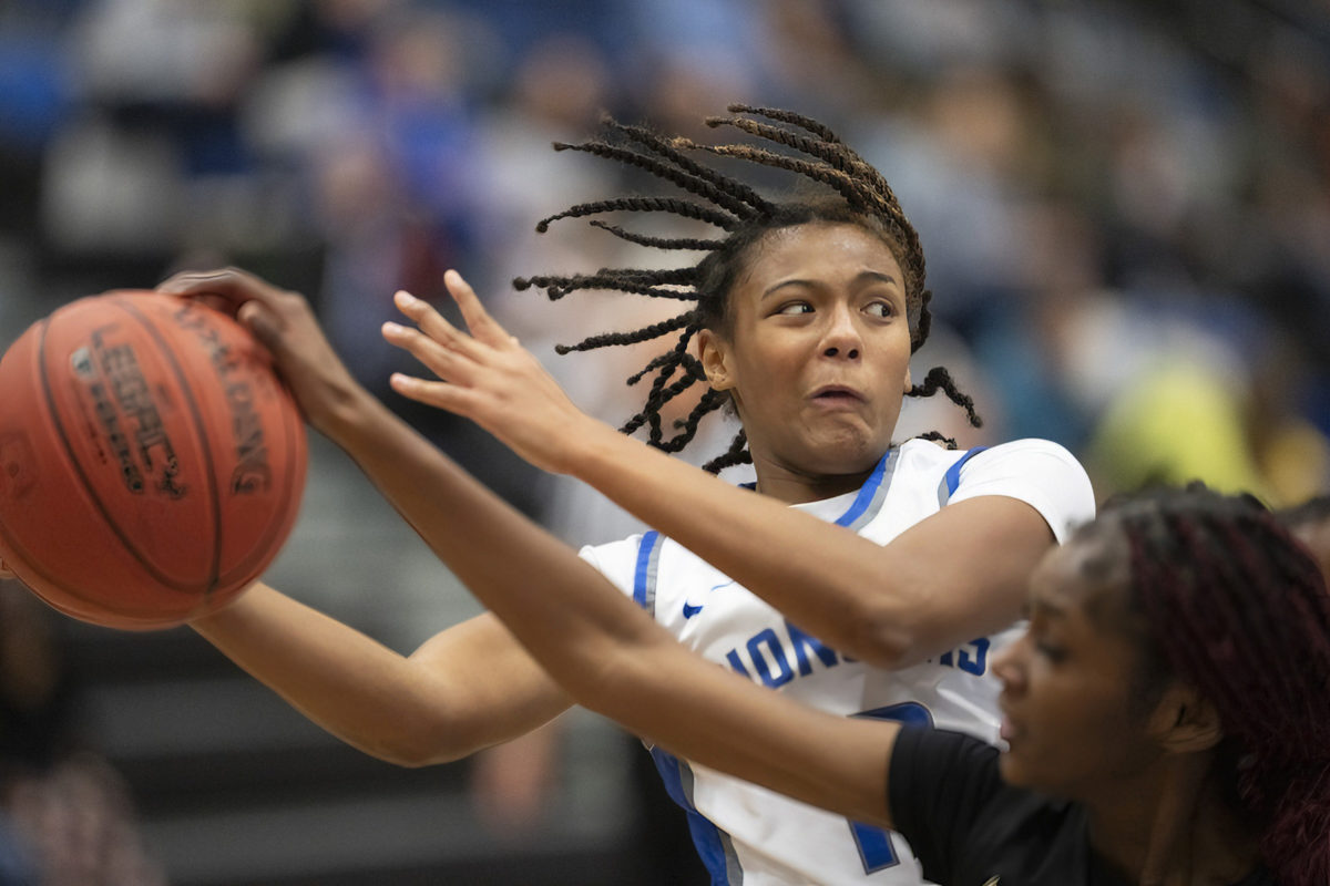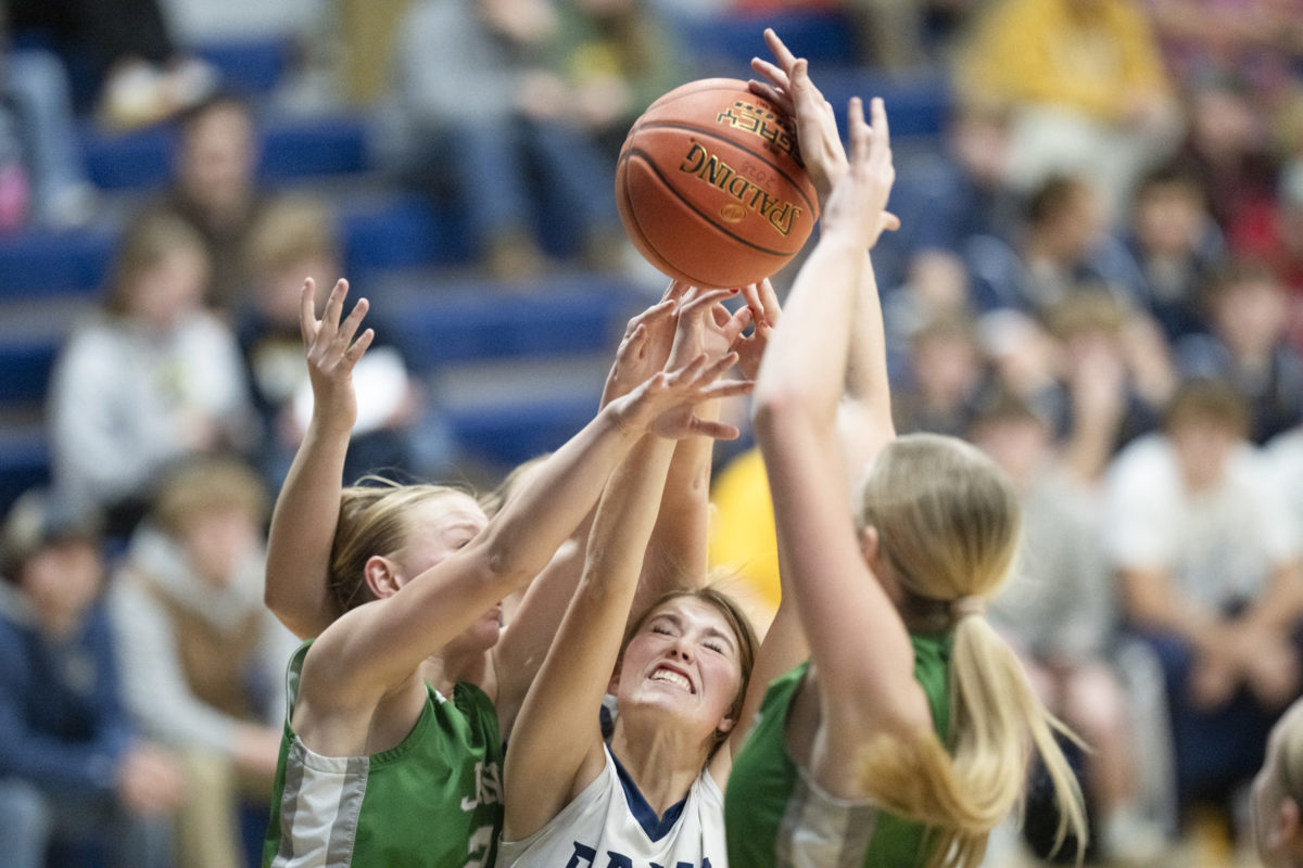 First: Strong timing captures the peak of the rebound battle, with overlapping arms and facial expression conveying effort and intensity. The tight crop and clean background keep the focus on the moment of competition.