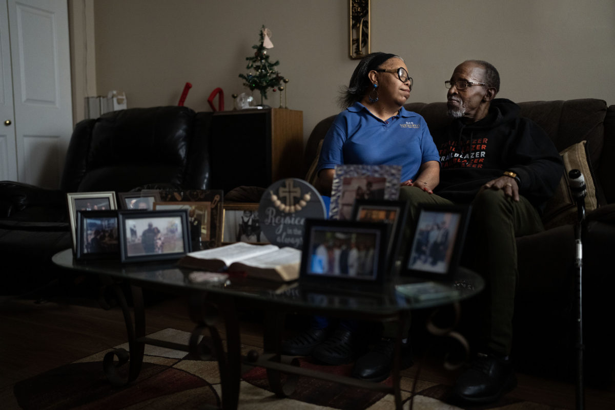 2) Targeted lighting of the couple adds depth separating them from momentos in a home they are about to lose. Caption information elevated this photo.