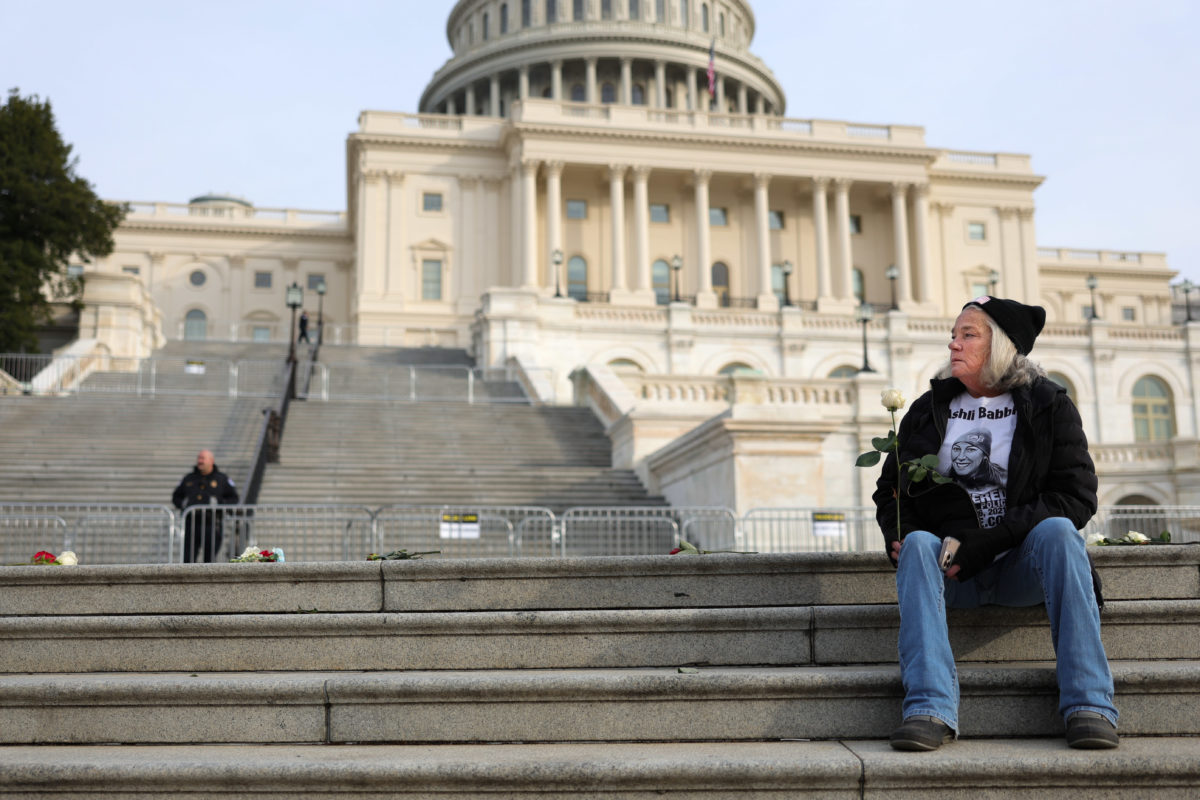 2) A quiet moment of a mother grieving the loss of her child. The wider composition showing the Capitol gives a sense of place.