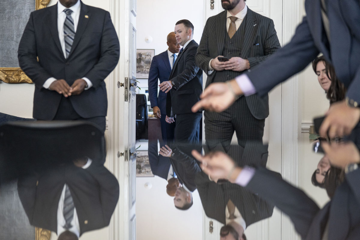 1) The photographer did an excellent job of putting themselves in the right place to take advantage of the glass top table. The moment has layers, reflections and a hand leading the viewer's eye back to the person of interest, the Governor. The is an excellent example trying something different while waiting for an event to start.