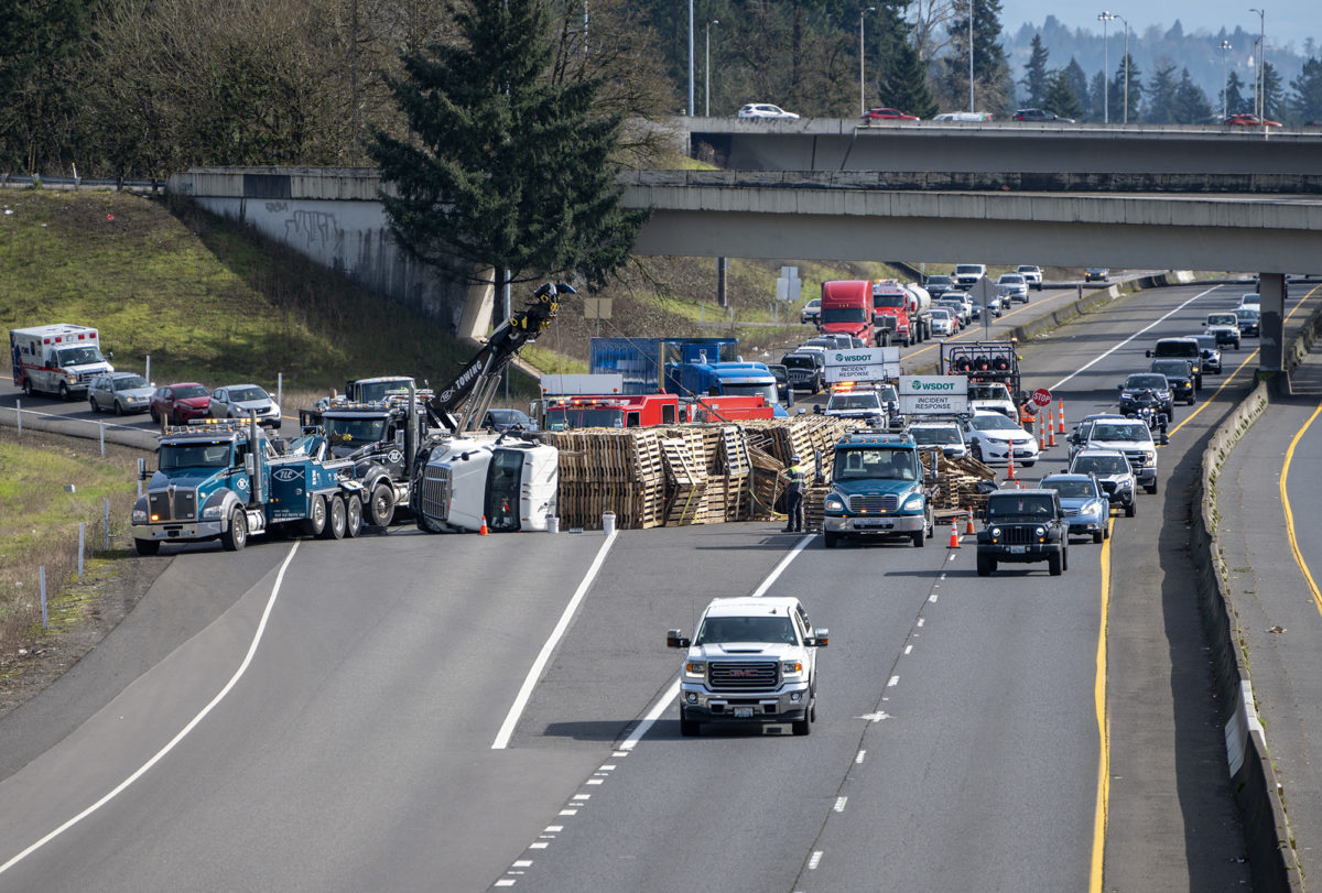 1: Nice job following the protester toward the ambulance, showing the seriousness, and capturing the moment when just the feet are sticking out. The caption helped a lot with this image and made it stand out above the rest. 2: Great on the photographer finding a view from what seems to be another bridge and getting a nice angle of the truck spill. 3: Great job covering the brush fire, which is notoriously difficult to photograph. Nice pictorial angle and view, including the fire below. Just wish the plane was above the tree line for a bit more separation.