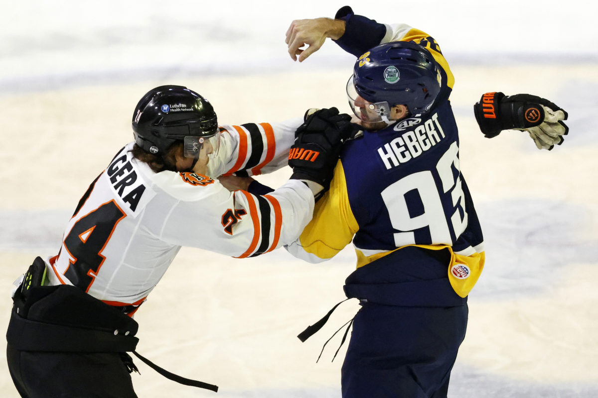 First place is a moment of all the right elements coming together: The player, emotion, puck, the action. Second place takes a moment, but the glove flying through the air is fun.